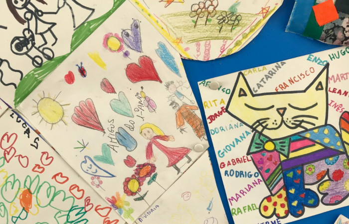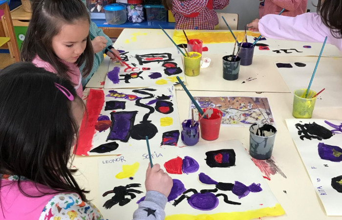 Ao pesquisar sobre o Arlequim, descobrimos uma obra de Joan Miró- O Carnaval do Arlequim, que eles quiseram reproduzir, e também partilhar com os alunos da escola.