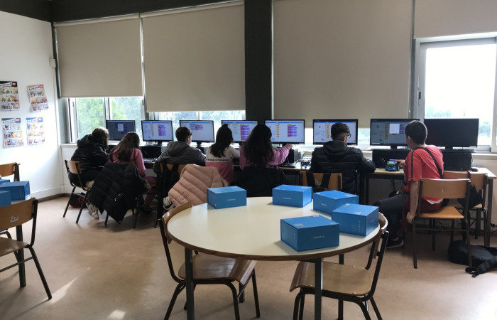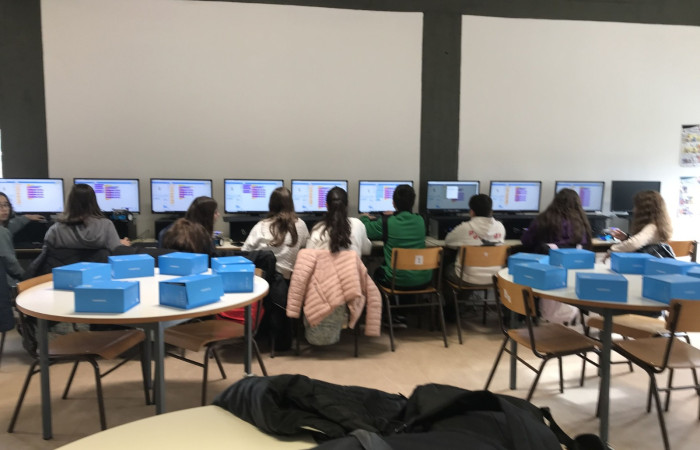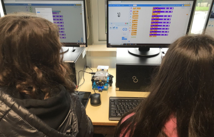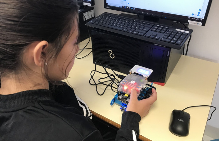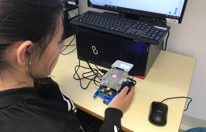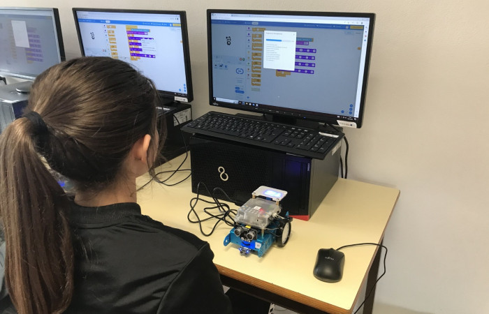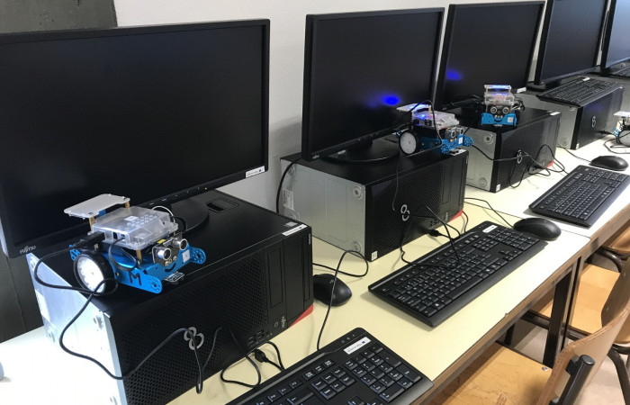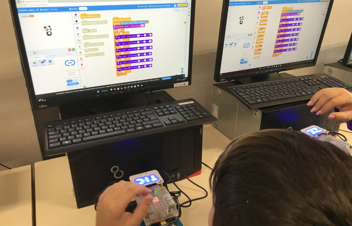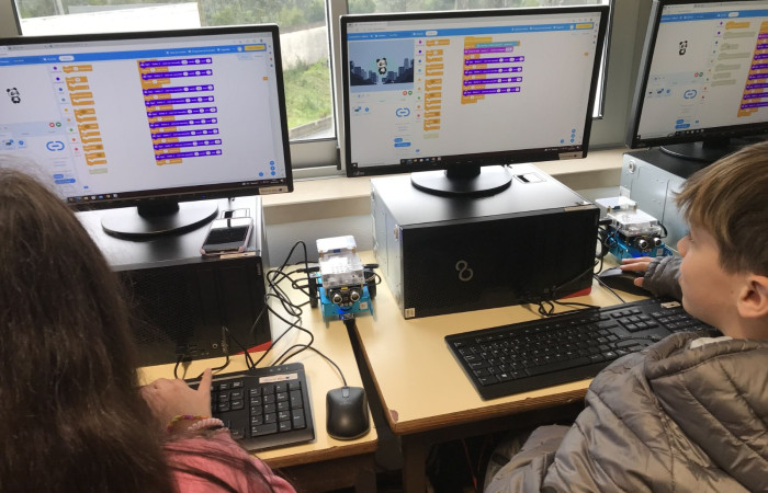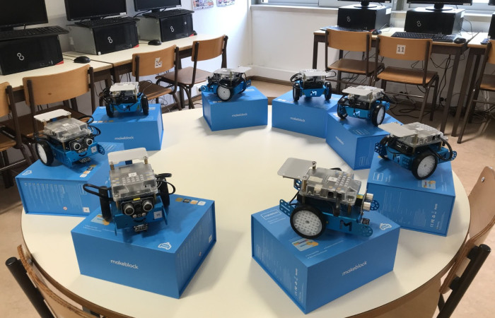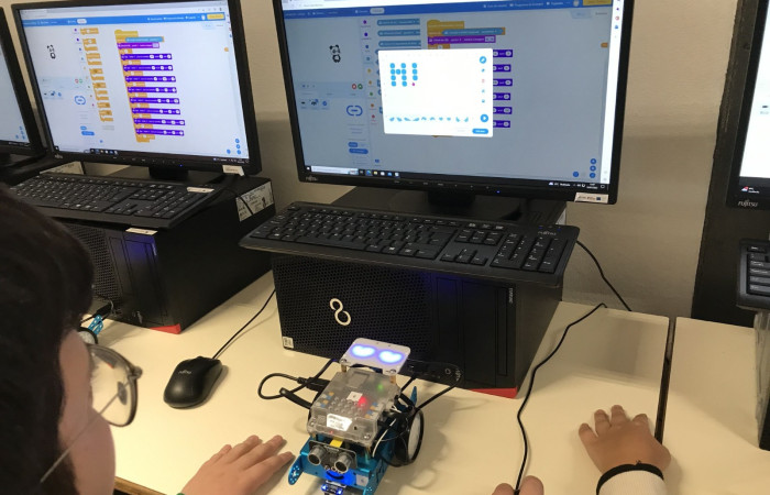 Hoje, 19 de janeiro de 2023, os alunos do 6.º B aprenderam a programar o robô mBot na aula de Tecnologias de Informação e Comunicação (TIC). O mBot Makeblock é um robô educacional que permite que os nossos alunos possam dar os primeiros passos ao nível da programação, da eletrónica e da robótica. O mBot é de fácil montagem e oferece infinitas possibilidades de aprender STEM (Ciência, Tecnologia, Engenharia, Matemática). Para além disso, o software mBlock de programação gráfica drag-and-drop (arrastar e largar), desenvolvido com base no Scratch, fornece uma maneira rápida de aprender a programação, controlar o robô e realizar várias funções.