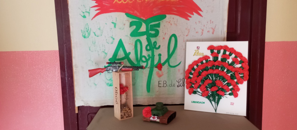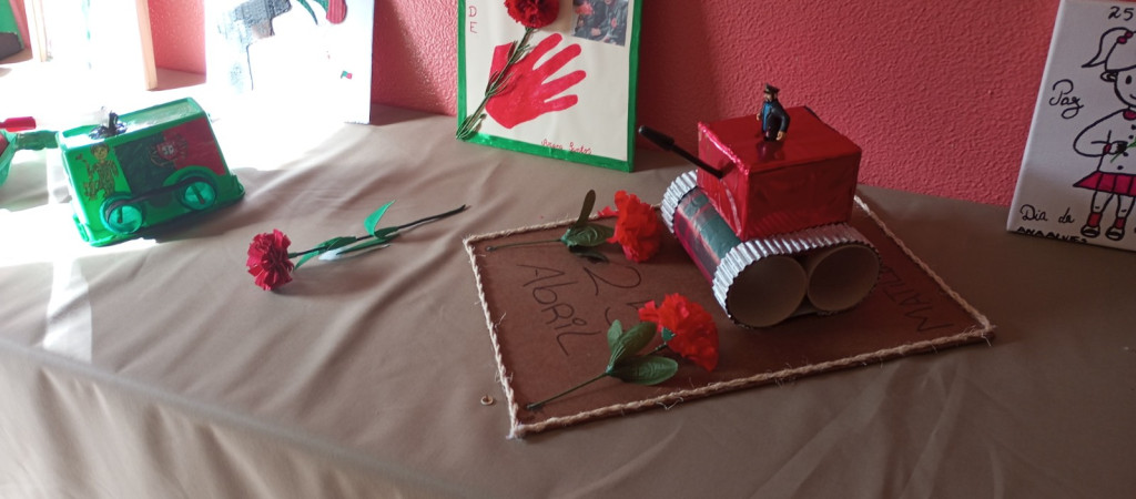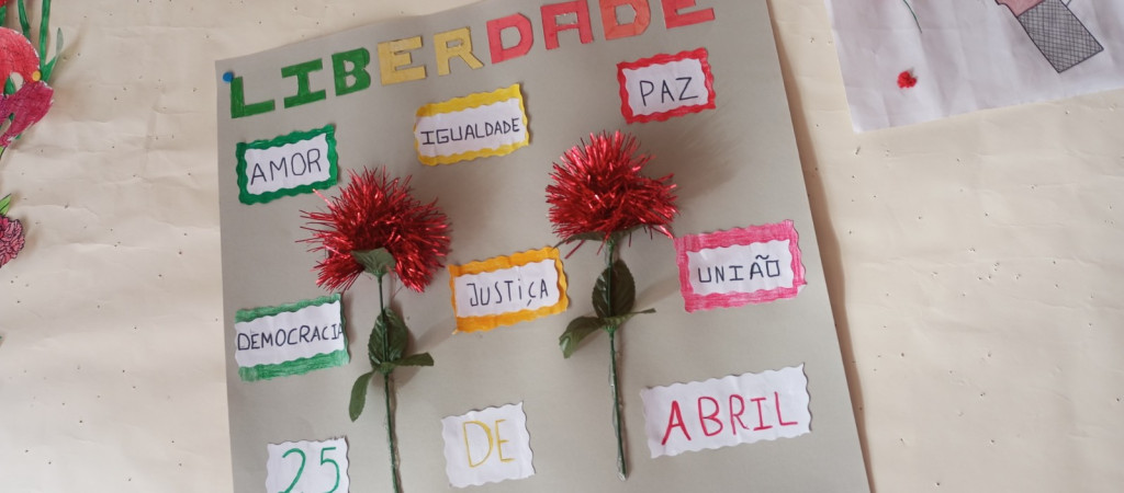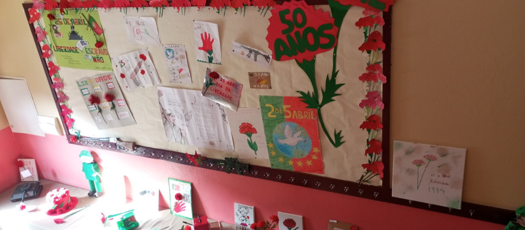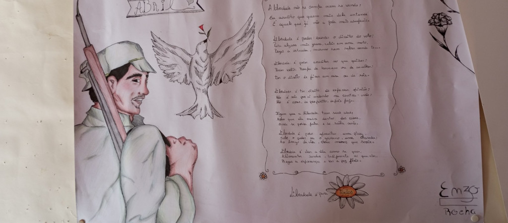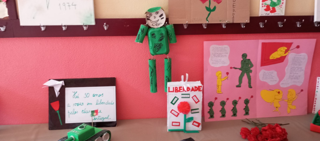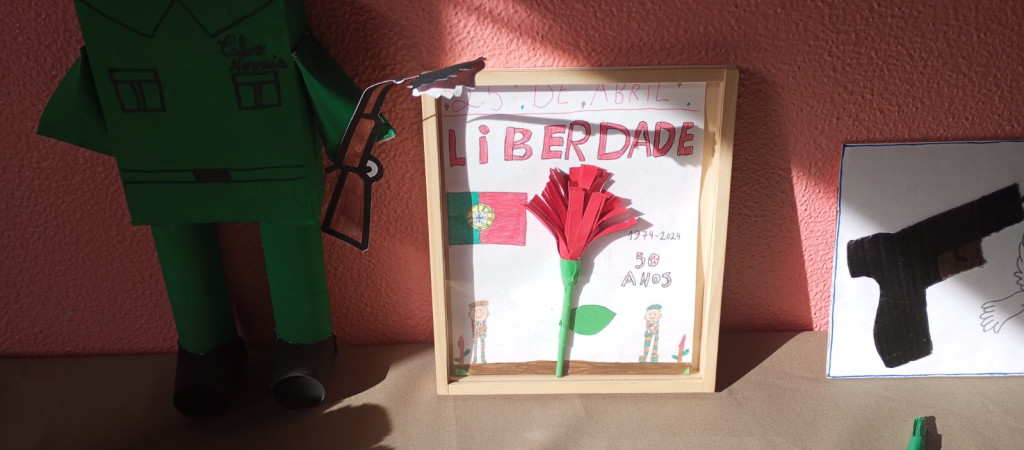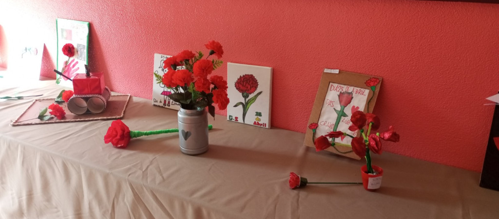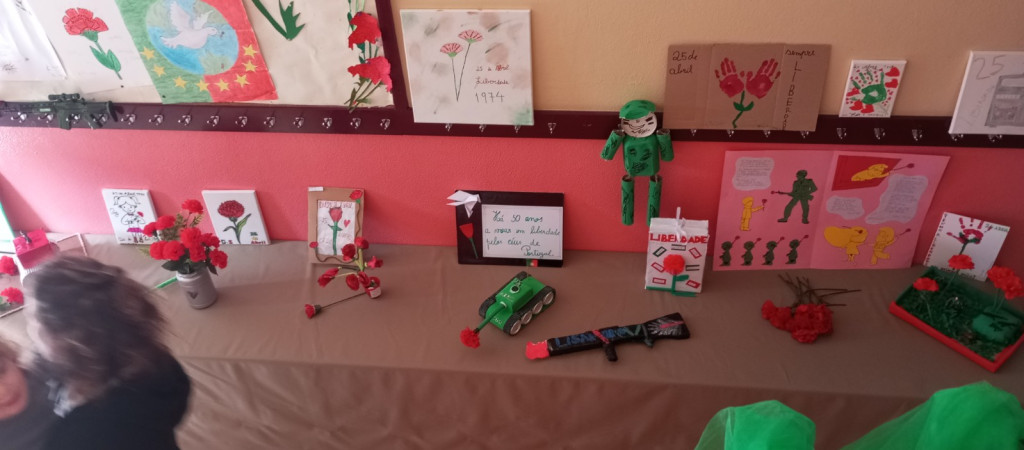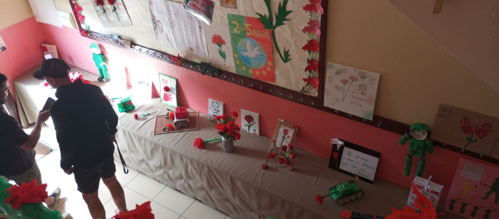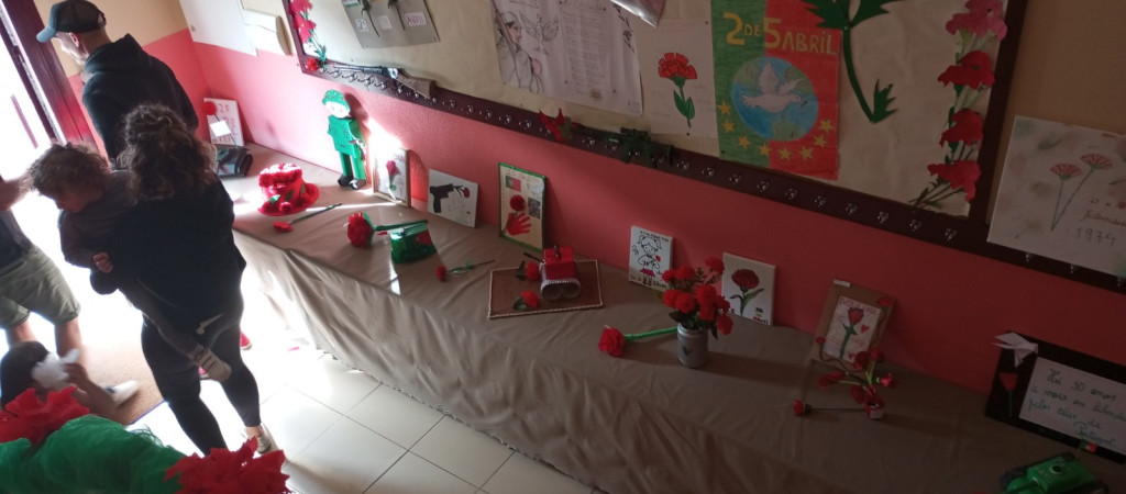 Exposição de trabalhos realizados pelos alunos, em família. Entoação da canção icónica da revolução "Grândola, Vila Morena”.