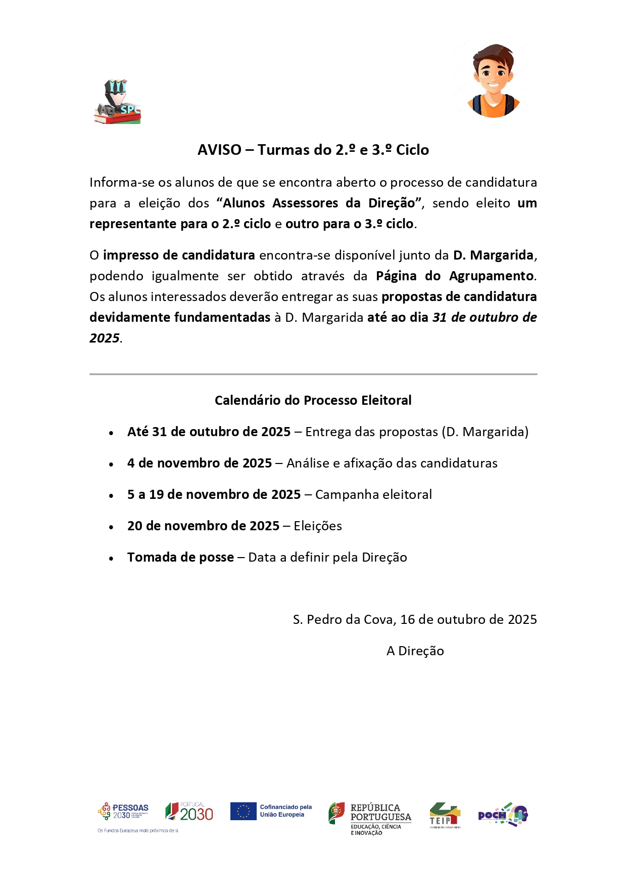 Informa-se os alunos de que se encontra aberto o processo de candidatura para a eleição dos “Alunos Assessores da Direção”, sendo eleito um representante para o 2.º ciclo e outro para o 3.º ciclo.