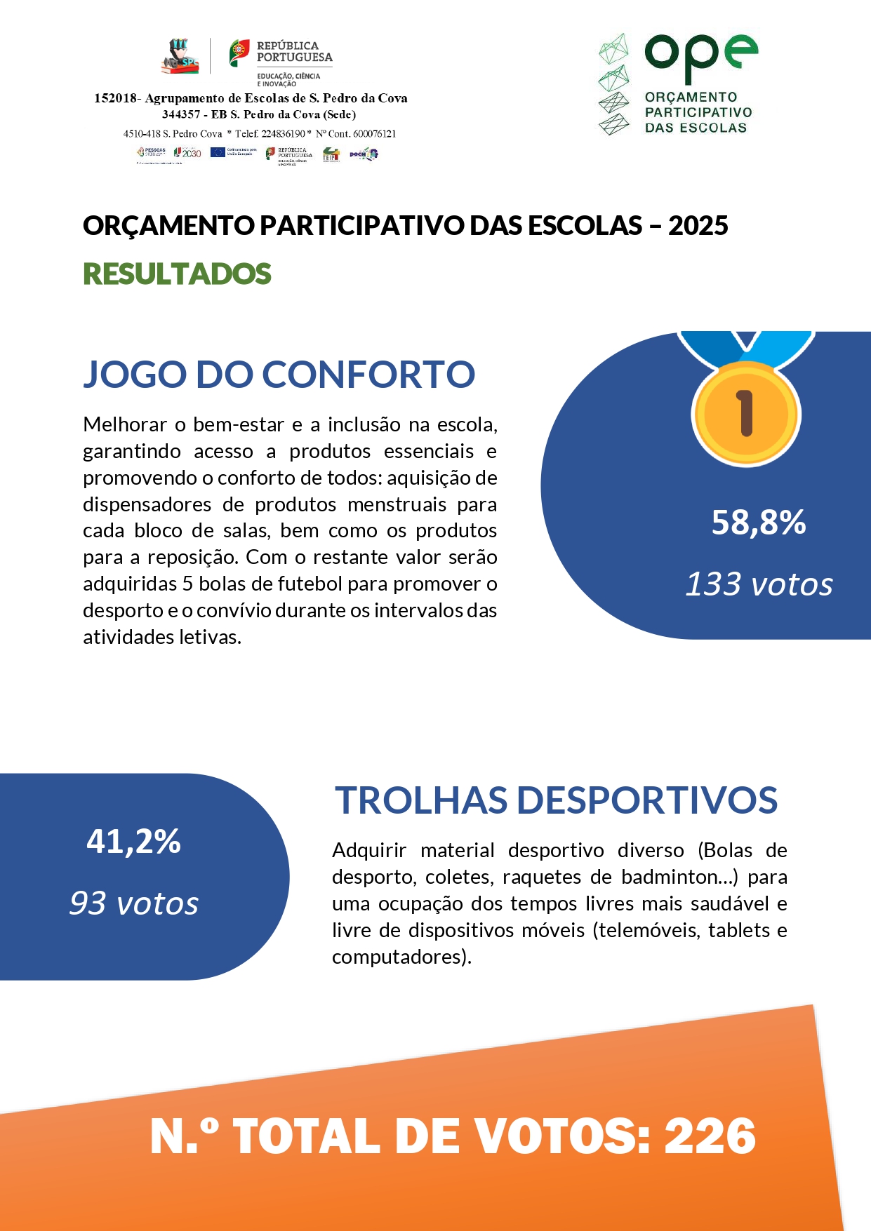 O resultado da votação das propostas apresentadas no âmbito da iniciativa 'Orçamento Participativo das Escolas 2024/2025' já está disponível.