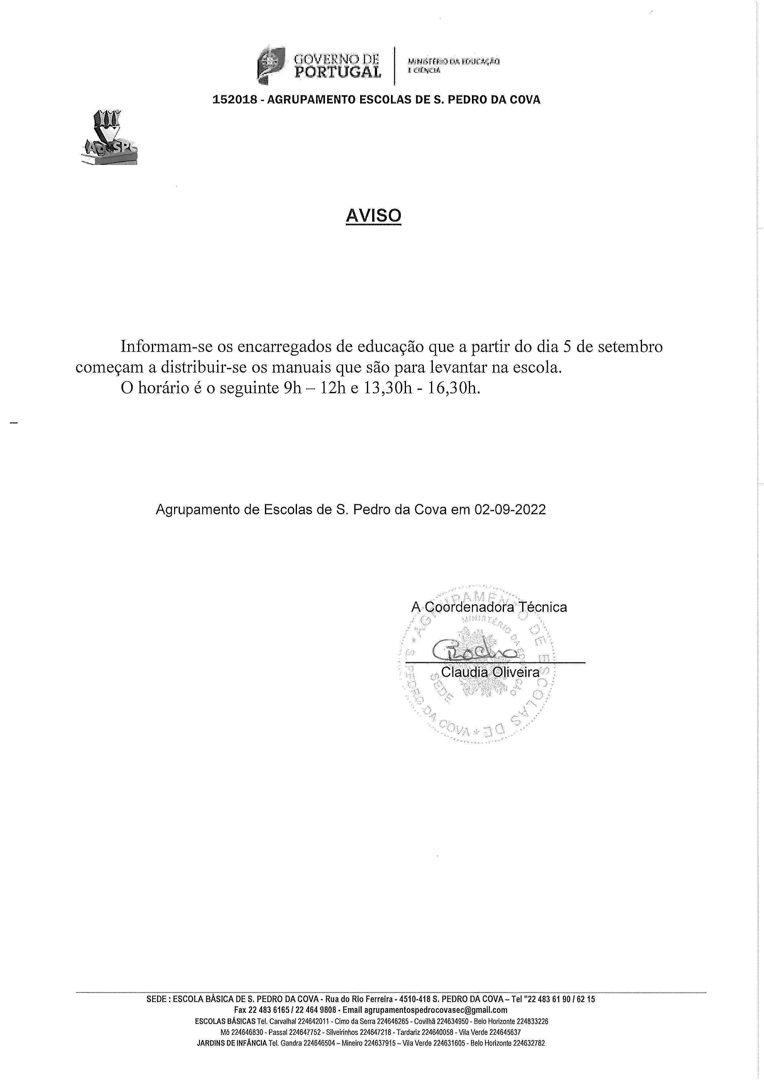 Avisam-se todos os alunos e Encarregados de Educação que a distribuição dos manuais reutilizáveis para o ano letivo 2022/2023 será efetuada, na escola sede, a partir do dia 5 de setembro e de acordo com o horário seguinte: 9:00 às 12:00; 13:30 às 16:30.