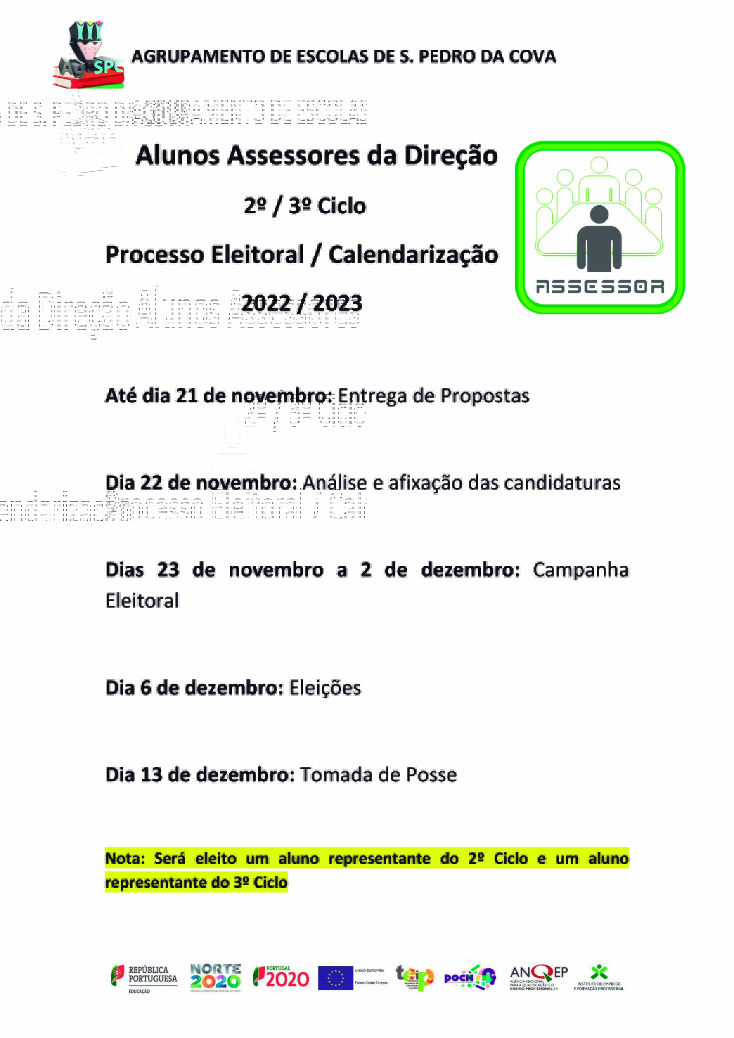Informam-se os alunos que está aberto o processo de candidatura para os “Alunos Assessores da Direção”, um assessor para o segundo ciclo, outro para o terceiro ciclo.