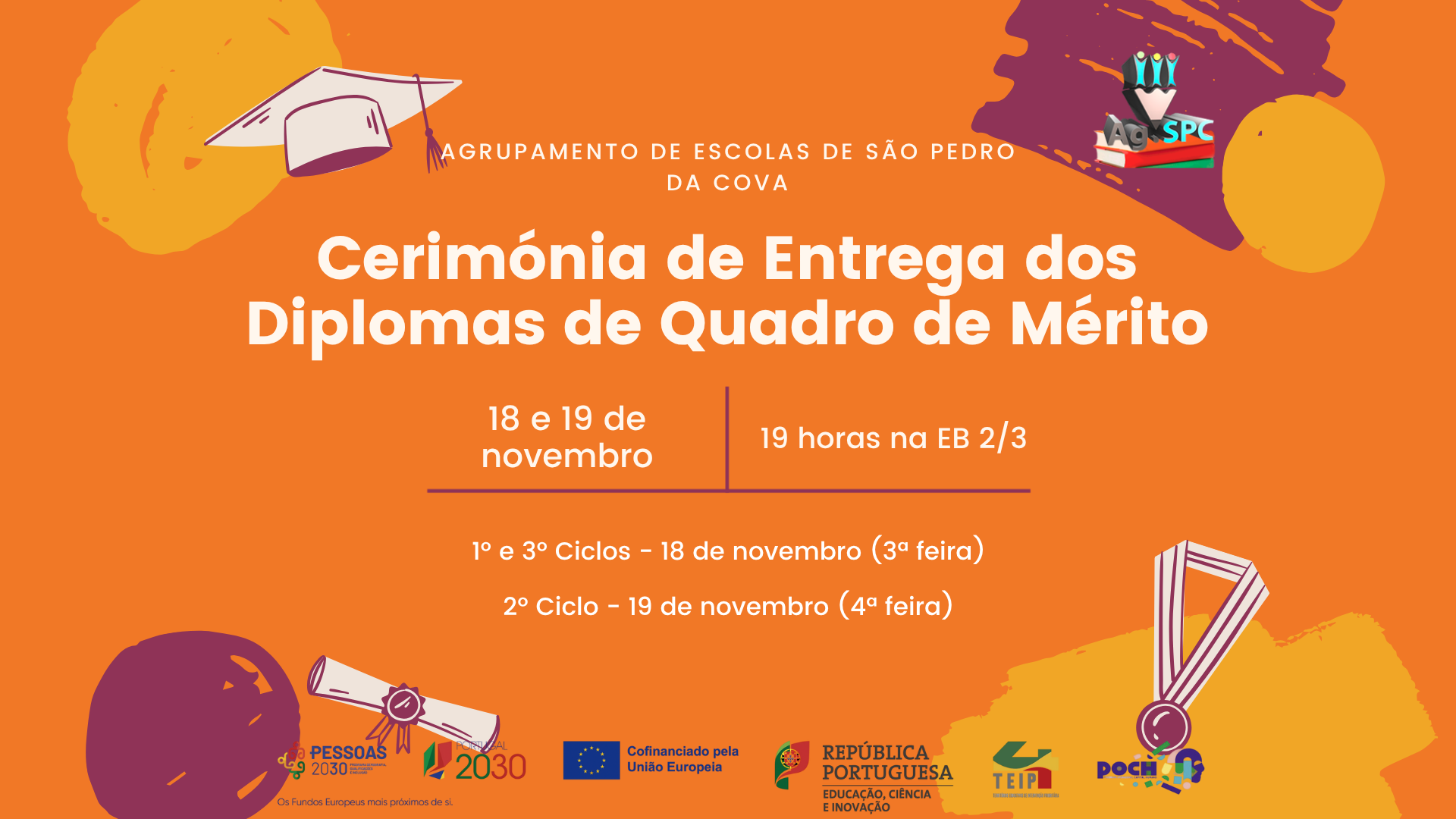 O Agrupamento de Escolas de São Pedro da Cova, na pessoa da Senhora Diretora, Dra. Maria Goreti Portela, tem a honra de convidá-lo/a, assim como ao/à seu/sua Encarregado/a de Educação, a estarem presentes na Cerimónia de Entrega dos Diplomas de Quadro de Mérito, referentes ao ano de 2024/2025, na Escola Sede, a partir das 19h, no dia 18 de novembro para os 1º e 3º ciclos e no dia 19 de novembro para os alunos do 2º Ciclo.