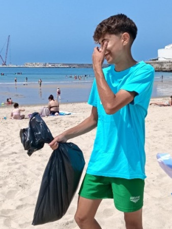 Depois, com um brilho nos olhos e um sorriso especial começa a tarefa de apanhar o lixo pela praia: plásticos, pontas de cigarro, embalagens de chicletes, papéis, vidros, restos de arames e latas de refrigerantes… há um pouco de tudo, até fraldas de bebé enterradas na areia! Os banhistas, a princípio ficam surpreendidos, muitos pensarão “Estas miúdas e estes miúdos – e já agora os professores – têm coragem. Não têm vergonha de estar a apanhar o lixo que os outros deixam!”. E então, surpreendidos, alguns fazem perguntas, “de onde vêm?”, “porque estão a fazer isto?”. Depois das explicações dadas e, já sem surpresa, outros começam a reunir o lixo à sua volta e vêm entregar-nos com um “obrigado”, até um pouco envergonhado.