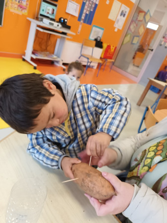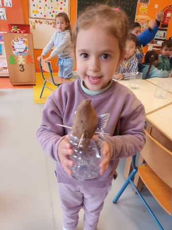 Com esta atividade, aprenderam a fazer o plantio de uma batata-doce em água! Trouxeram uma batata-doce e uma garrafa de água de plástico e com a ajuda do adulto e de palitos, segurou-se a batata. Depois as crianças colocaram junto à janela, e agora vamos ver o que acontece! Será que se lhes dissermos palavras bonitas crescem mais rápido?