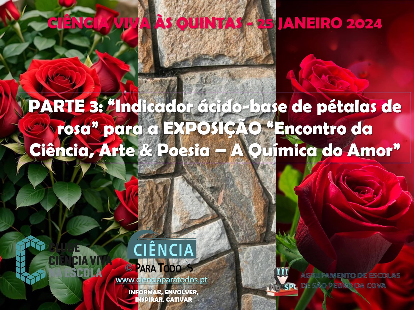 O desafio estava em cima da mesa do laboratório de Física e Química. Extrair o pigmento das pétalas de rosas vermelhas e preparar um indicador natural de pH (em solução e em papel)! Mais uma etapa concluída com sucesso para a construção da exposição. As etapas seguintes da preparação da exposição continuam nas próximas sessões “Ciência Viva às Quintas”. Esta atividade tem a mentoria e a ideia criativa e produtiva do PDC – CIÊNCIA PARA TODOS.