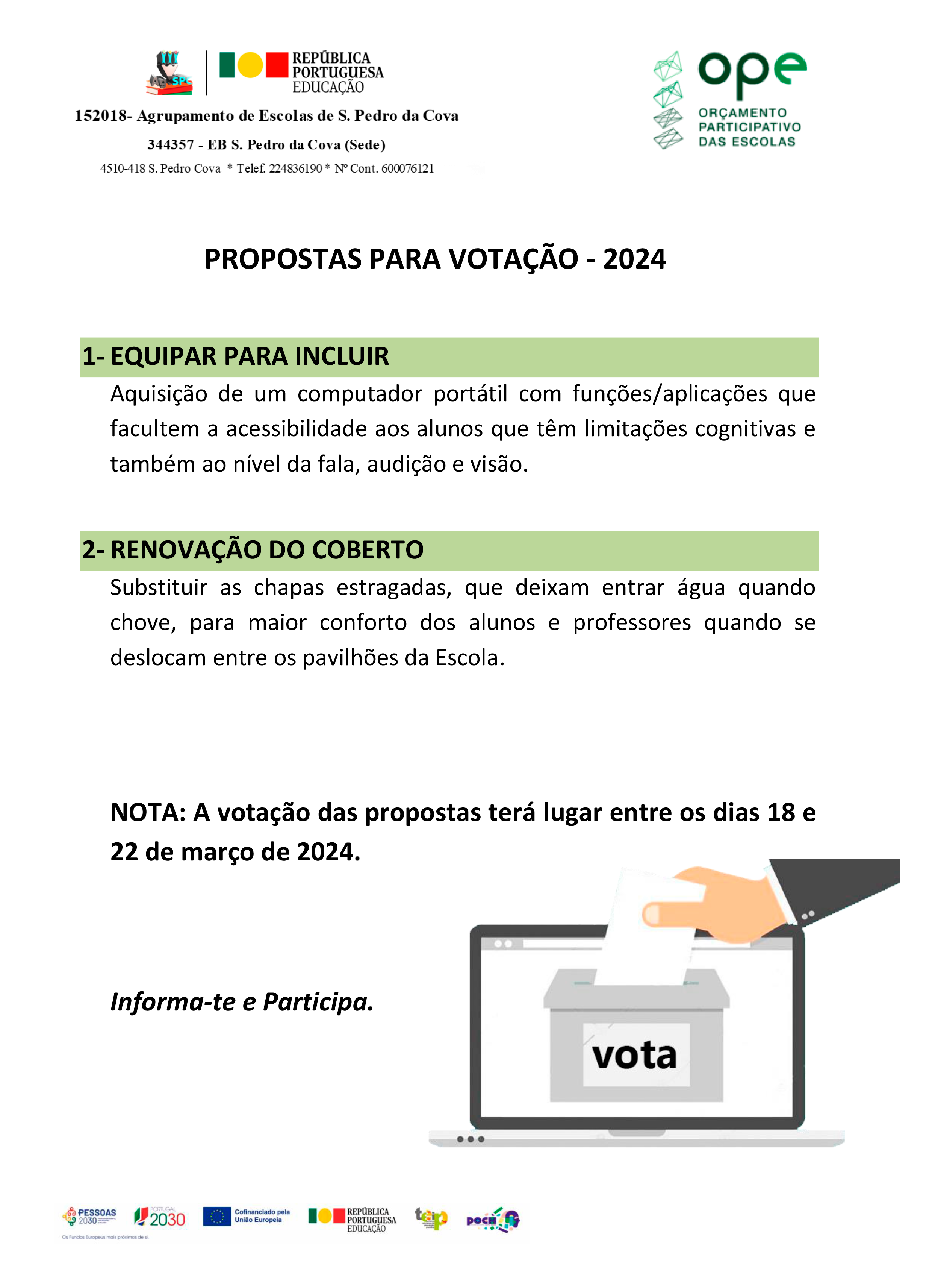 Já se encontram disponíveis as propostas para votação, no âmbito do Orçamento Participativo das Escolas 2024.