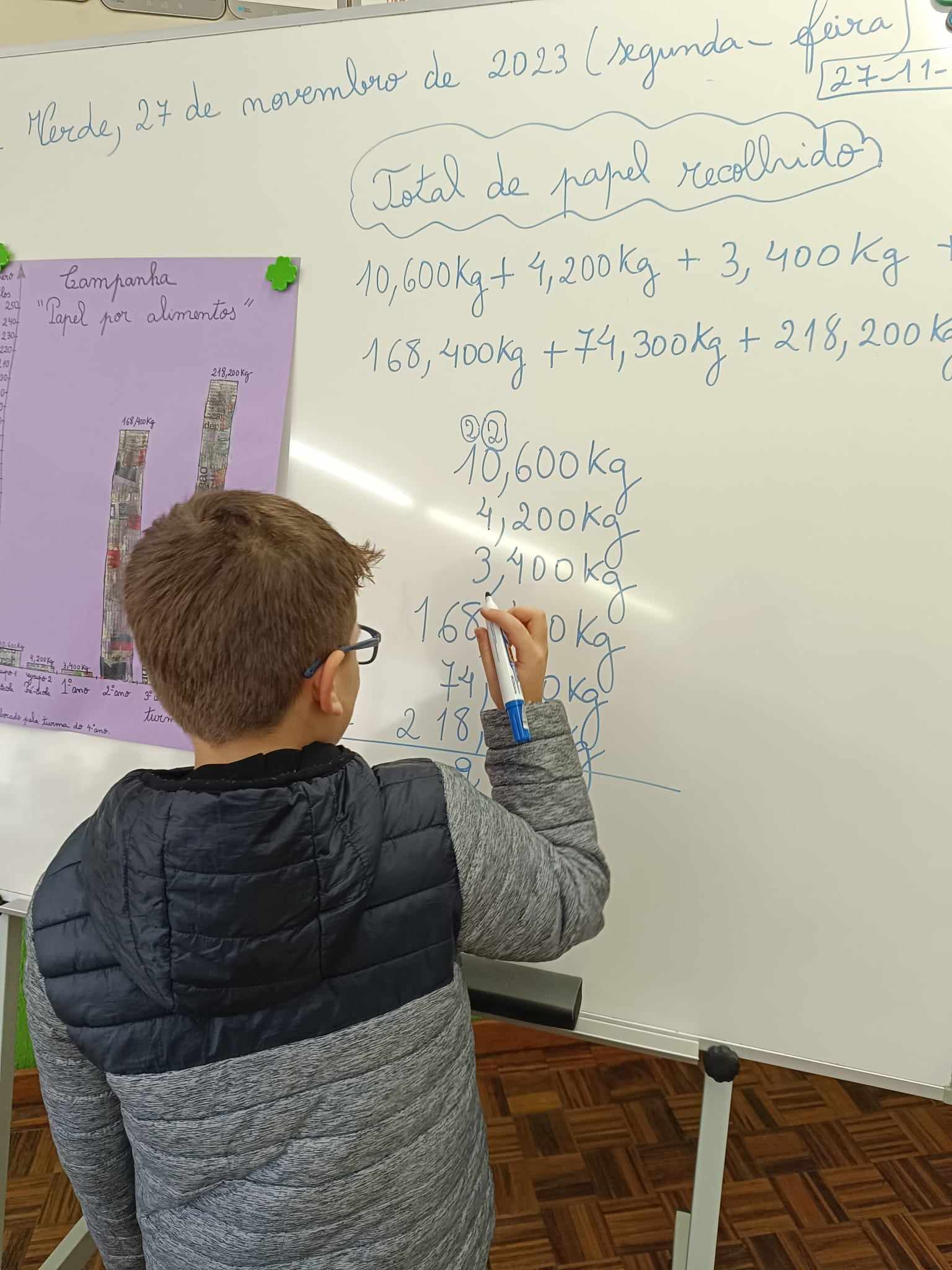 Verificou-se que a turma que angariou mais papel foi a turma do 4º ano com 218,200 kg. A escola juntou no total 479,100kg, que foi um resultado muito bom.