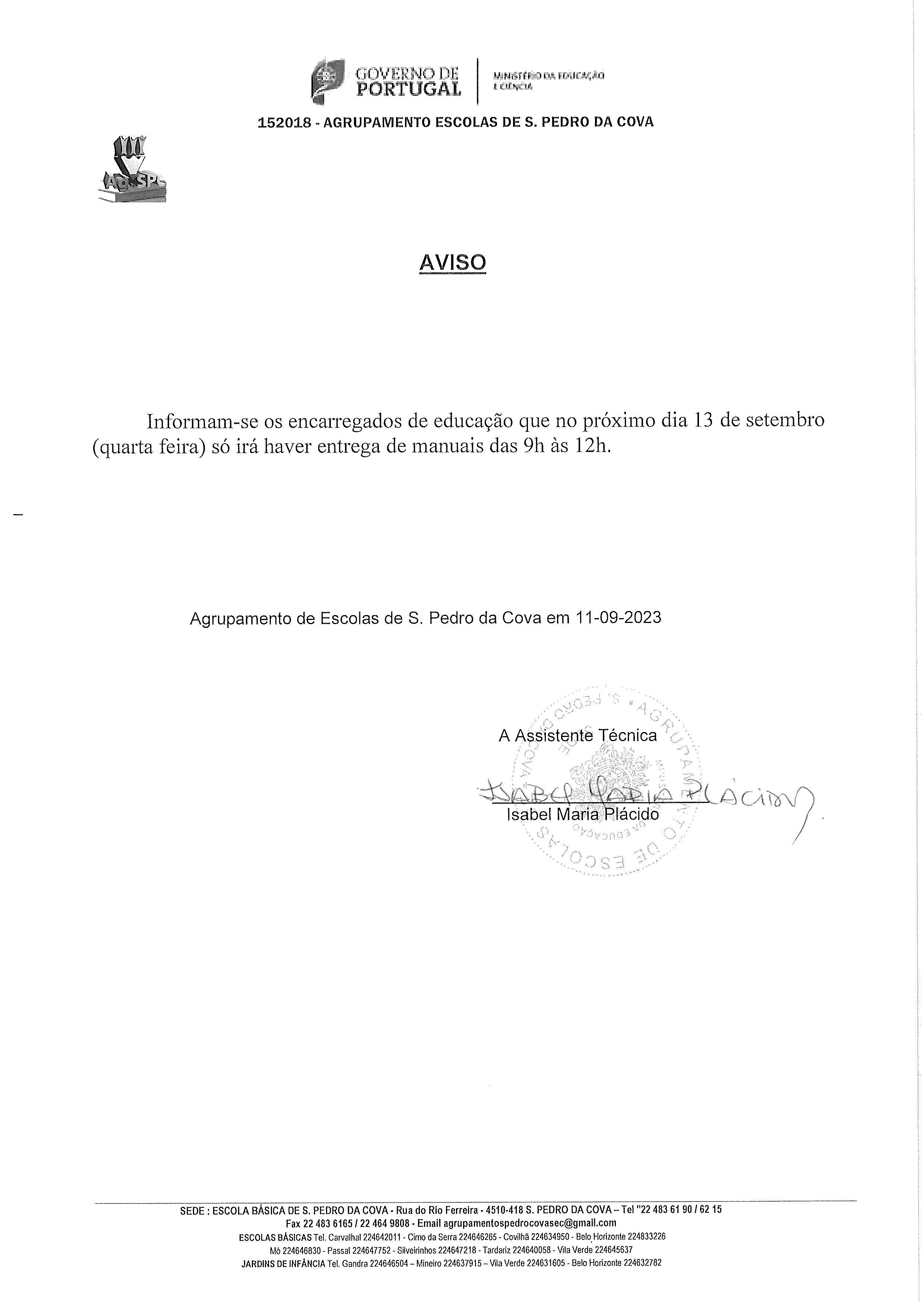 Informam-se todos os encarregados de educação que no próximo dia 13 de setembro (quarta-feira) só irá haver entregas de manuais das 9h às 12 h.