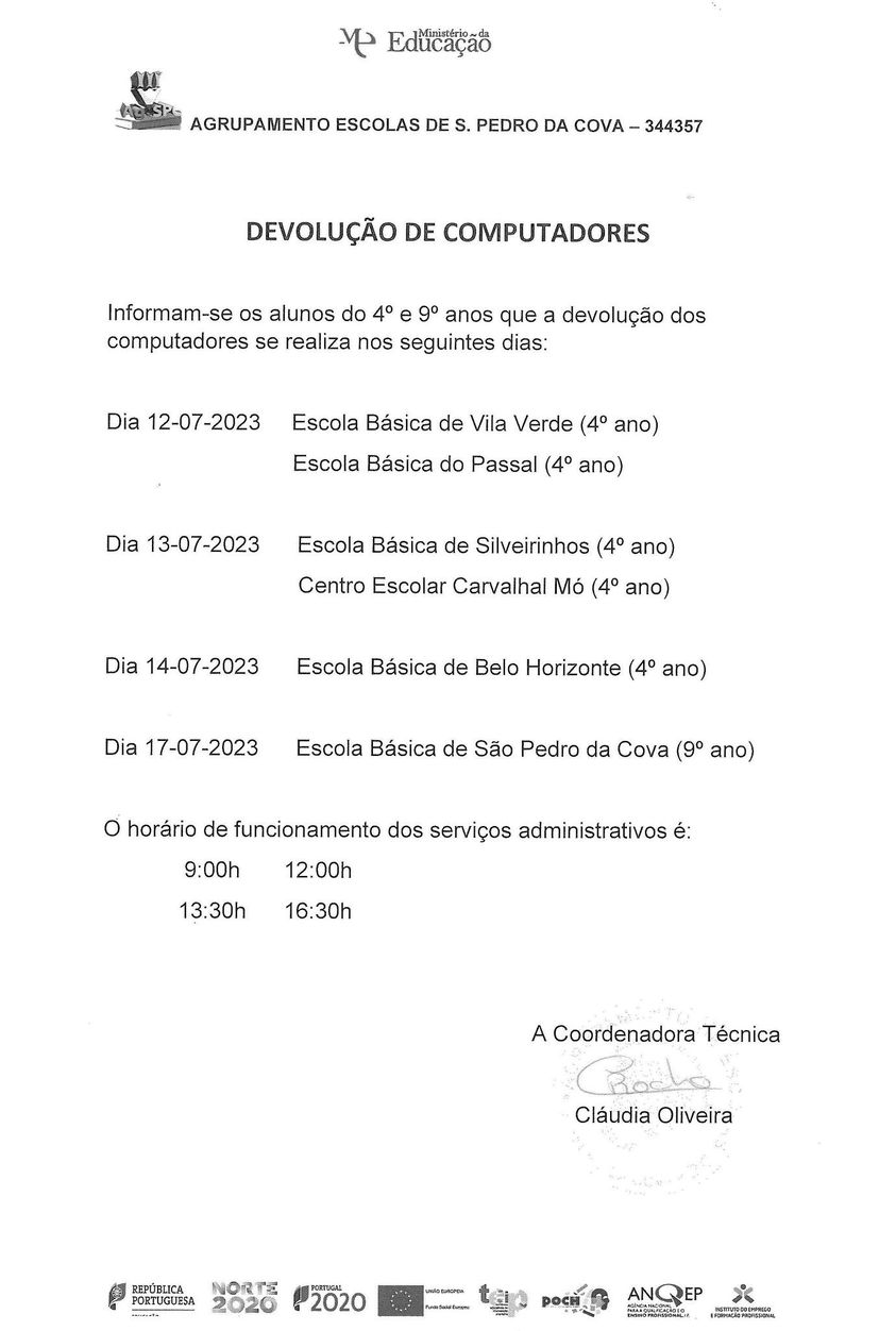 Já se encontra disponível o calendário para a devolução dos computadores dos alunos do 4.º e 9.º anos.