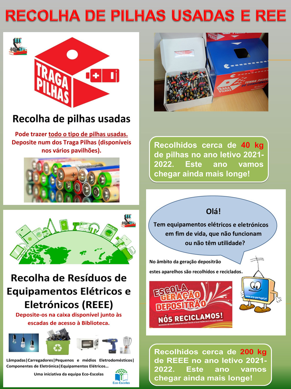 No dia 14 de junho (4ºfeira), dia do Agrupamento, o nosso tema é “Sou Cidadão Eco-Escola”. Participa nesta iniciativa com a Troca de Pilhas, Resíduos de Equipamento Electrónico (REE) e outros Resíduos Sólidos Urbanos, por materiais usados, em bom estado, que também podes trazer (precisam de uma Nova Vida).