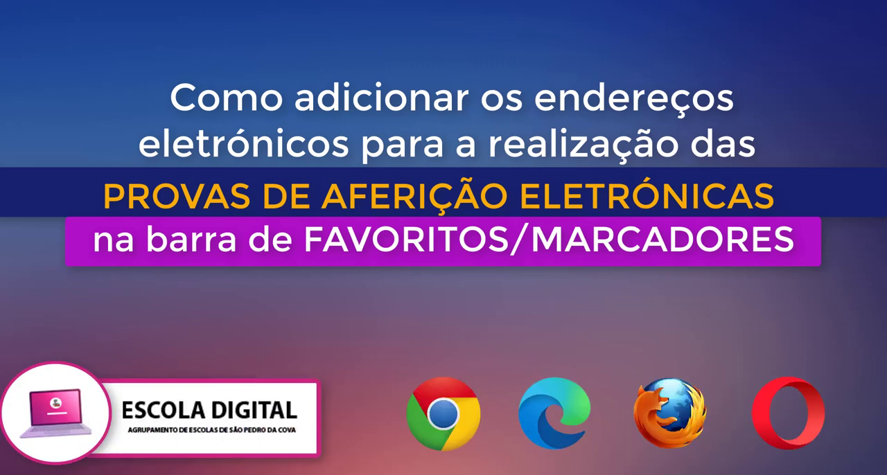 Disponibiliza-se um vídeo tutorial que explica, passo a passo, como adicionar os endereços eletrónicos, para a realização das provas de aferição, na barra de favoritos/marcadores nos diferentes navegadores/browsers.