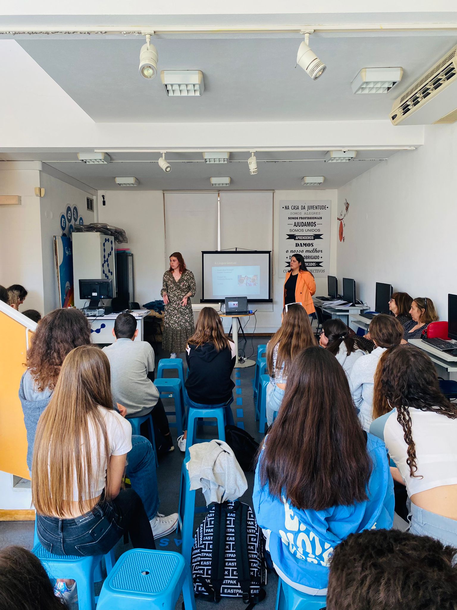 No passado dia 20 de abril, a turma F do 8.º ano participou numa sessão de sensibilização da Língua Gestual intitulada “Voz nas Mãos”, que decorreu na Casa da Juventude de S. Pedro da Cova. O projeto “Voz nas Mãos” é da responsabilidade da Divisão da Educação do Município de Gondomar e desenvolvido em parceria com a Associação de Surdos do Porto. Esta problemática afeta cerca de 120 mil portugueses e cerca de 5 por cento da população mundial. A sessão esteve a cargo da Dr.ª Elsa Ascensão (Técnica de Língua Gestual do Município de Gondomar) e Sofia Pereira (Associação de Surdos do Porto) que sensibilizaram os alunos para as causas, dificuldades com que esta população diariamente é confrontada, passando por uma interessante partilha de palavras e expressões correntes da língua gestual. Os alunos foram acompanhados pelas professoras Fernanda Neves e Goreti Portela e pela Assistente Operacional Vânia. Todos os envolvidos fizeram uma avaliação muito positiva da atividade.