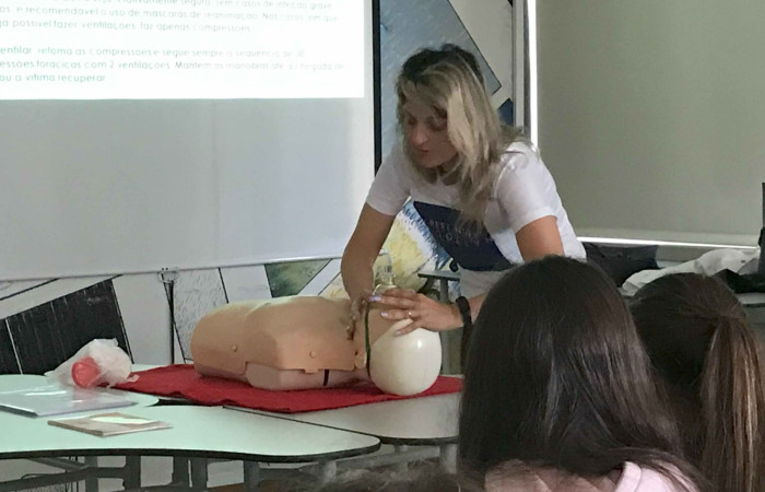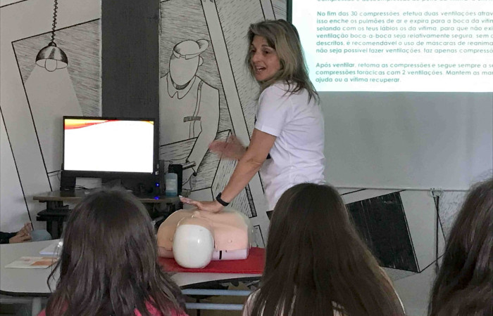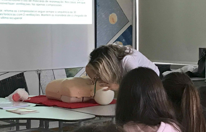 Os alunos do 6.ºA e 6.ºB tiveram a oportunidade de explorar a Cadeia de Sobrevivência, de visualizar e experienciar, em loco, a forma de atuação em situação de emergência e identificar os procedimentos para executar o Suporte Básico de Vida (SBV).
