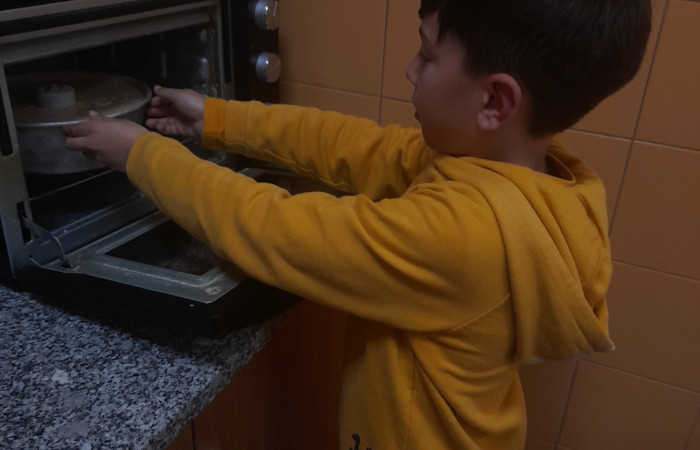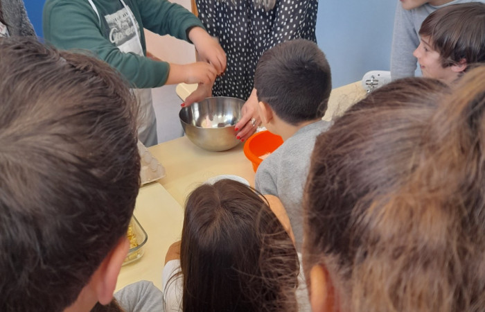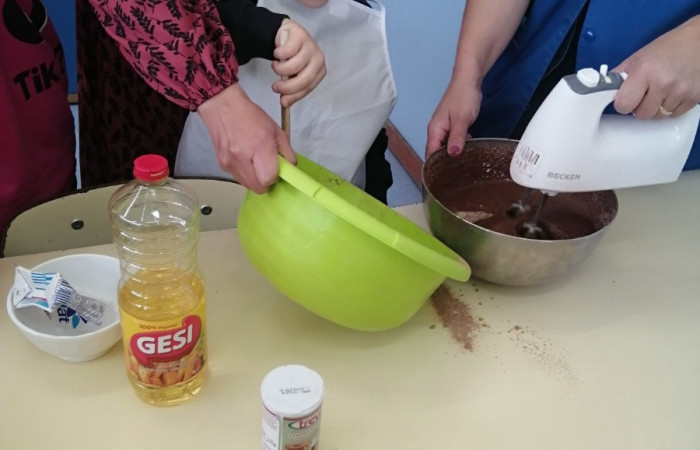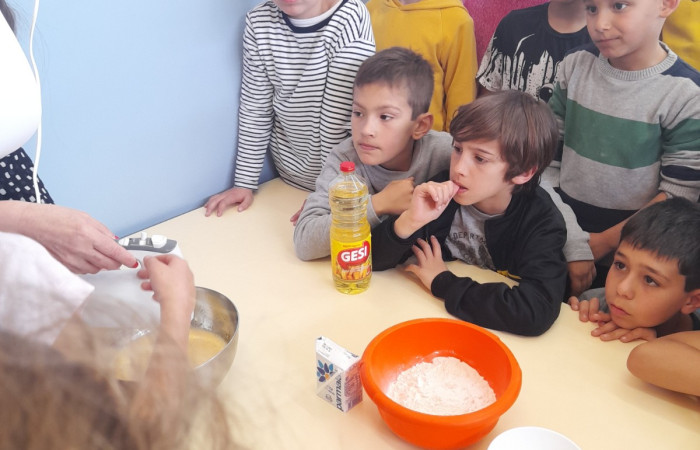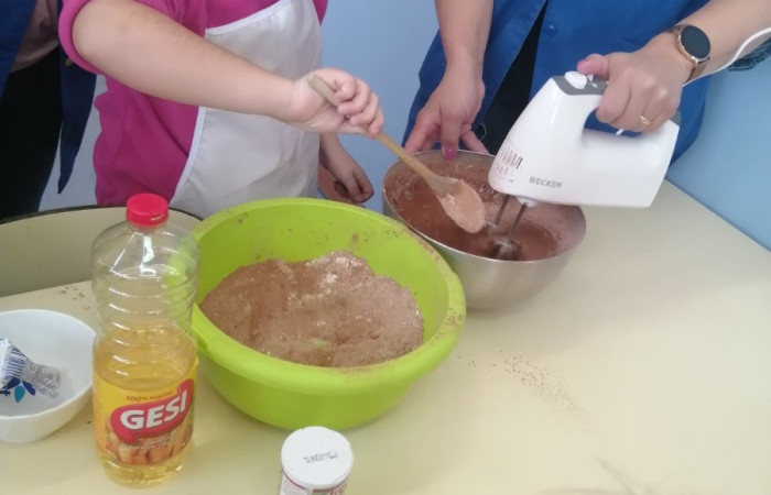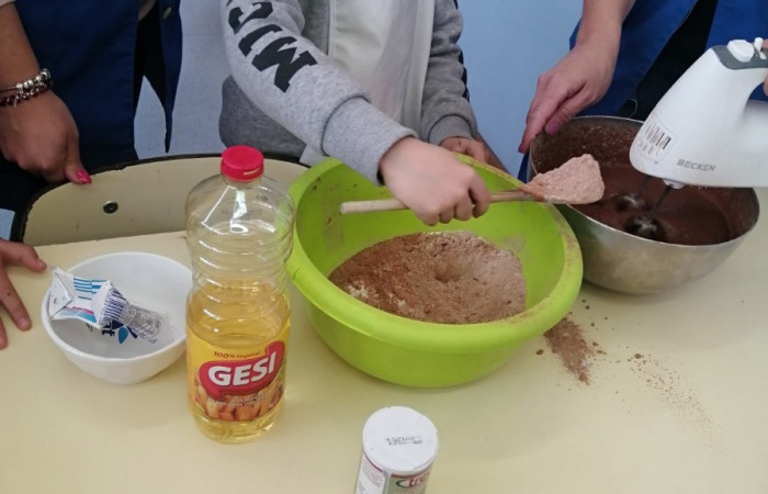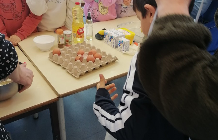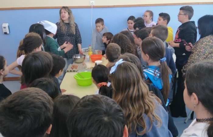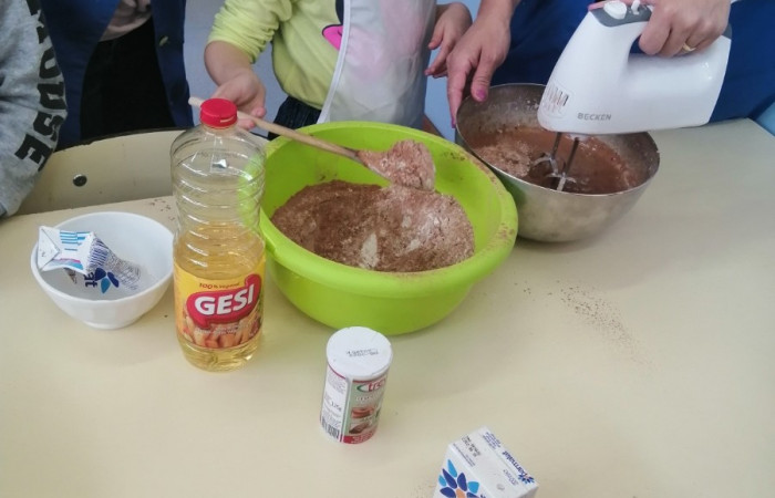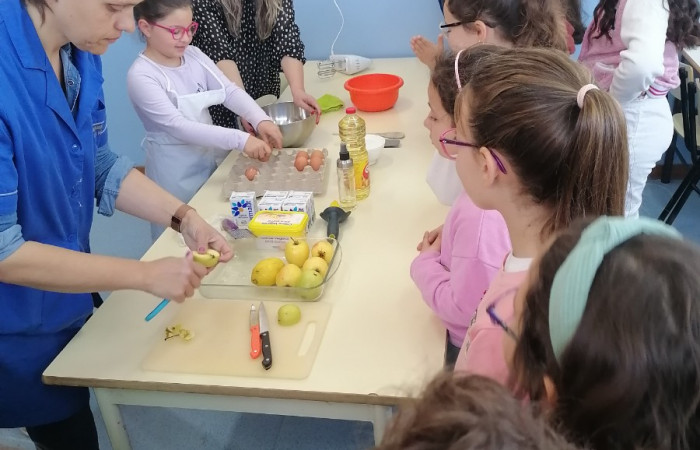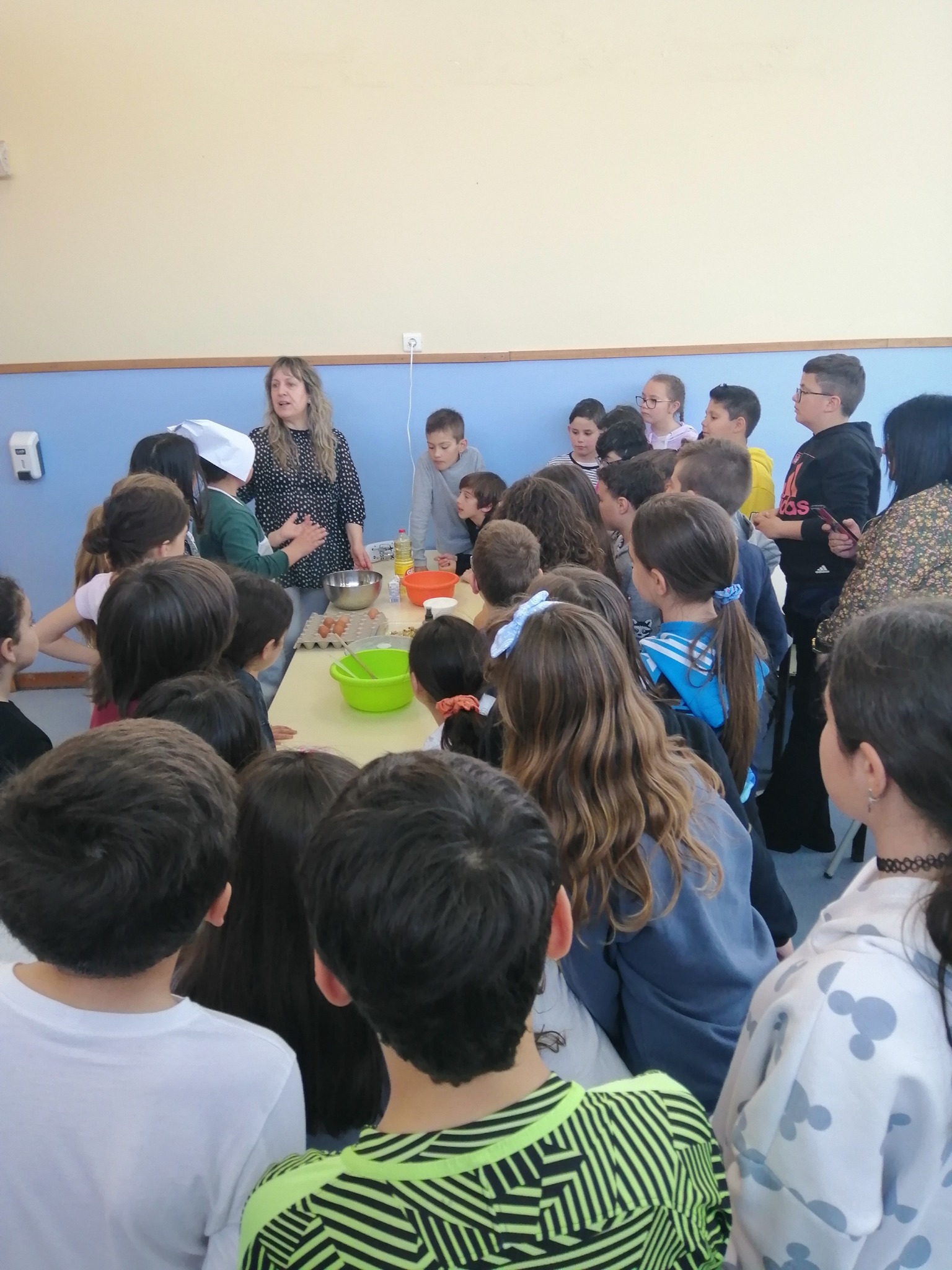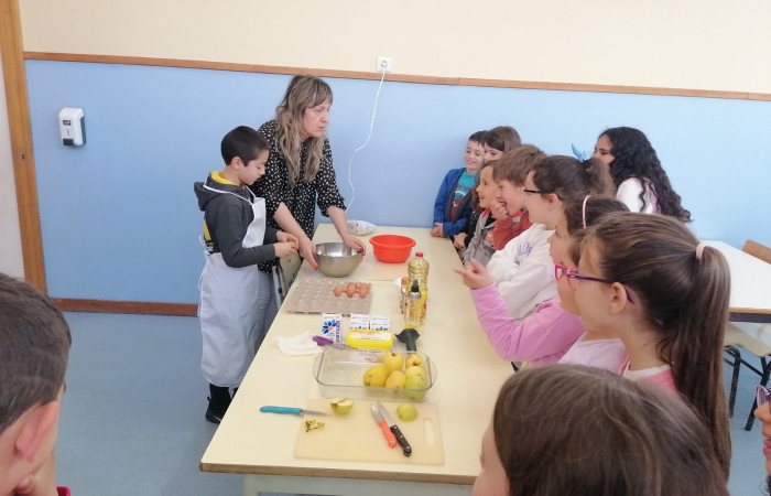Os alunos adoraram ajudar a preparar os bolos de maçã e de chocolate para a festinha da Páscoa.