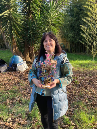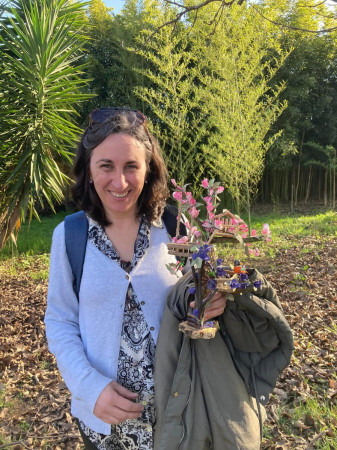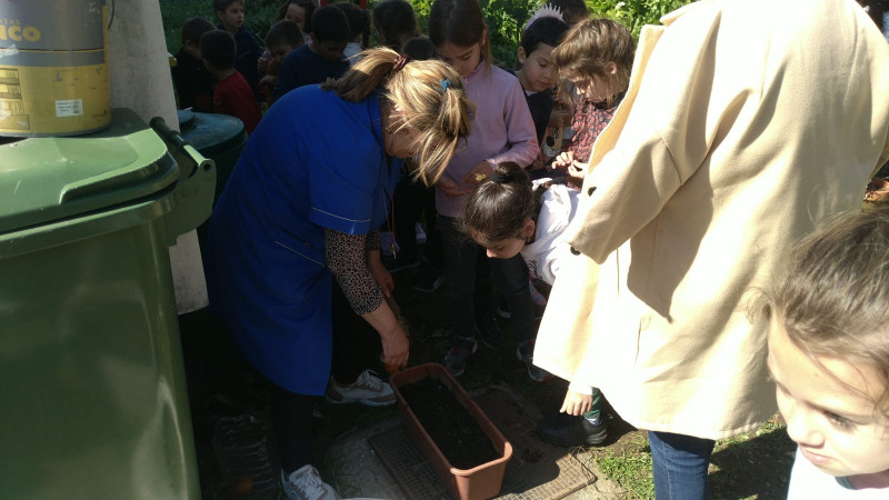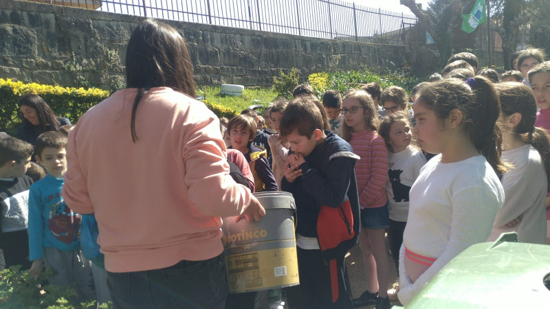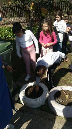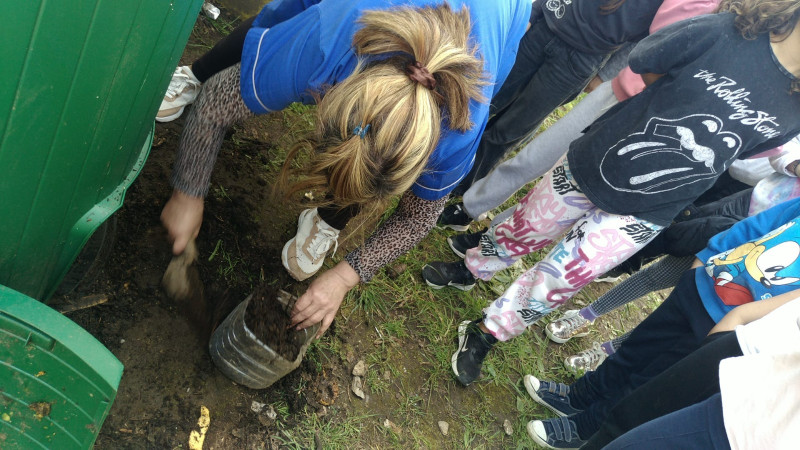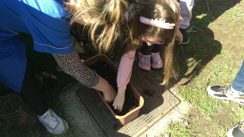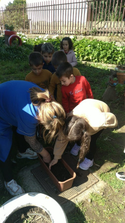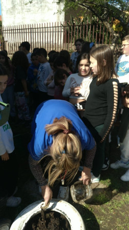 Os alunos semearam girassóis em vasos com terra enriquecida com adubo da nossa compostagem.
